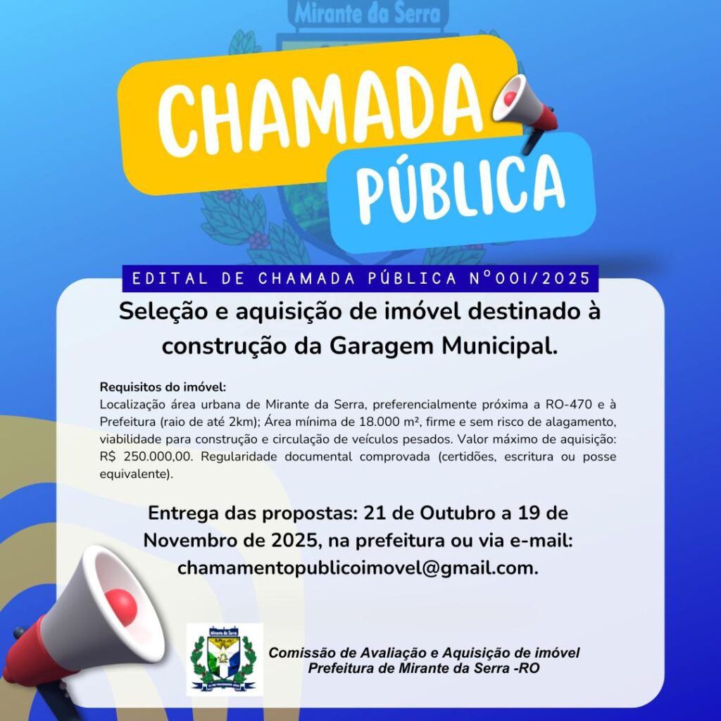 Garagem Municipal do Município de Mirante da Serra/RO. O presente Chamamento tem por objeto identificar e selecionar imóveis aptos à aquisição